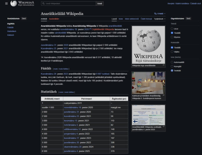 Anarâškielâ servi uárnee njuhčâmáánust Wikipedia-páájá Oulust. Juurdân lii čäälliđ, tivvoođ já tievâsmittiđ Wikipedia-artikkâlijd, savâstâllâđ Wikipedia-pargoost já siärvustâllâđ anarâškielân. Páájá stivriv Anarâškielâ seervi mediapargee Valtteri Valkeapolku já anarâškielâ ollâopâttâhlehtor Marja-Liisa Olthuis.